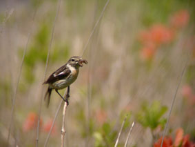 | ノビタキの♂は頭が黒いので、撮影したときに目が入るかどうかは偶然がたよりです(^_^;)。この絵には偶然毛虫が写っていました(^o^)/。 | ツーショットを撮りたかったのですが、今回は、上のような絵になりました。もう少し近かったらよかったかなと思います。 |
